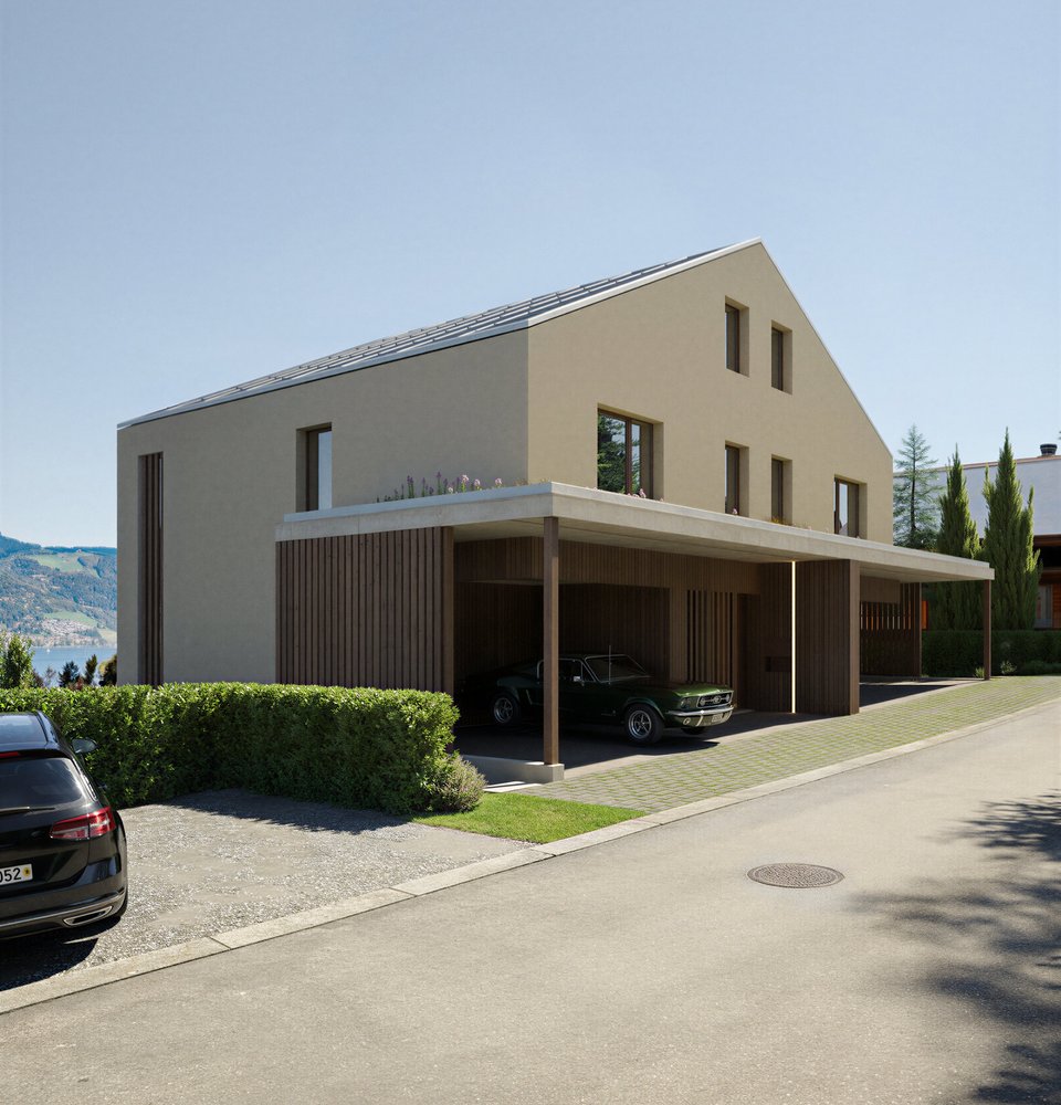 Auch technisch erfüllt das Gebäude die Anforderungen an energieeffizientes, zukunftsorientiertes Wohnen. Jede Einheit verfügt über eine eigene Luft-Wasser-Wärmepumpe mit Free-Cooling-Funktion für den Sommer, eine zentrale Komfortlüftung mit Wärmerückgewinnung sowie eine flächenintegrierte PV-Indachanlage. Zudem steht für jede Einheit ein Carport mit Platz für zwei Fahrzeuge zur Verfügung.