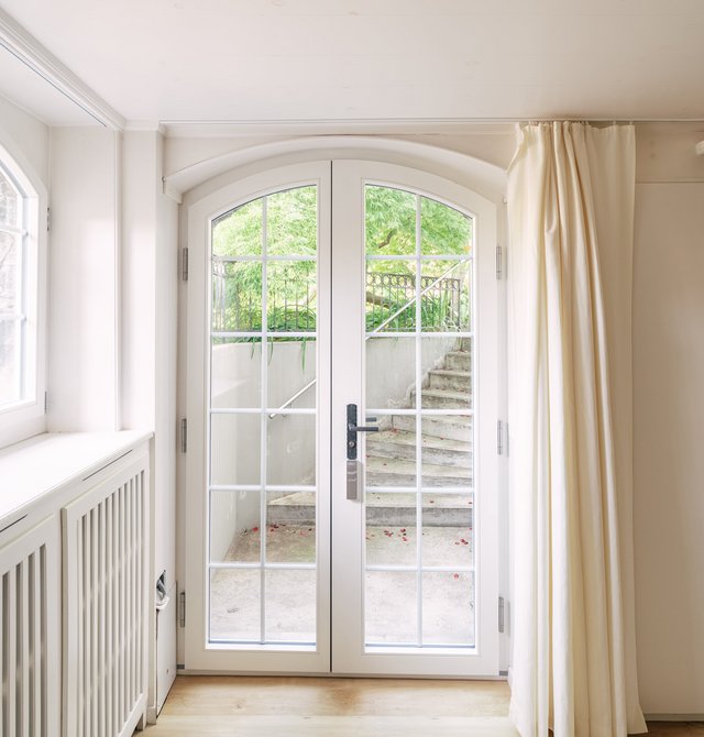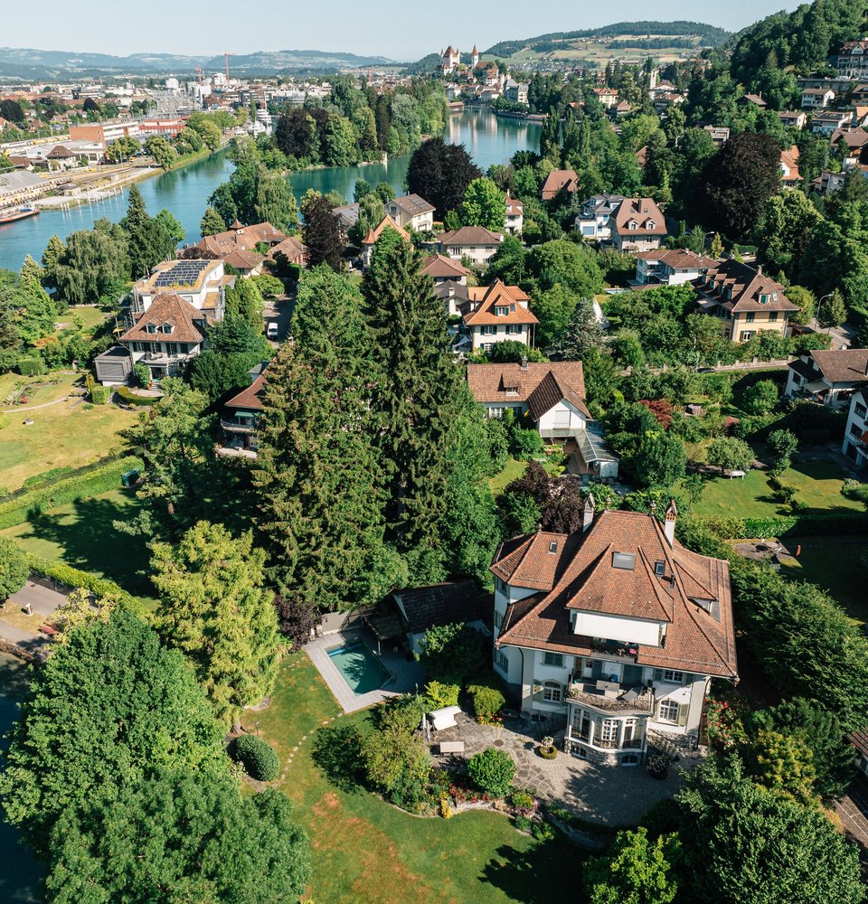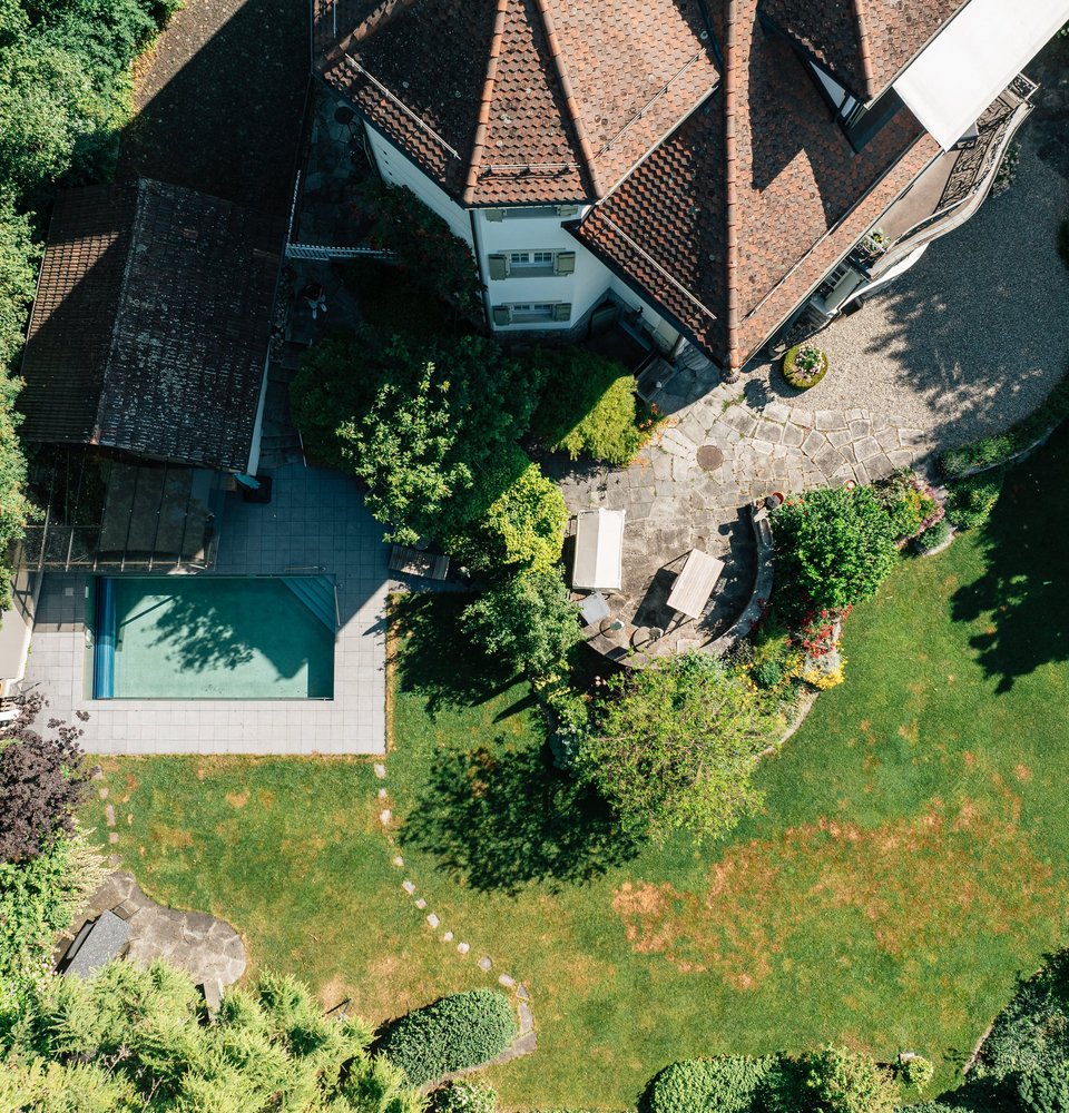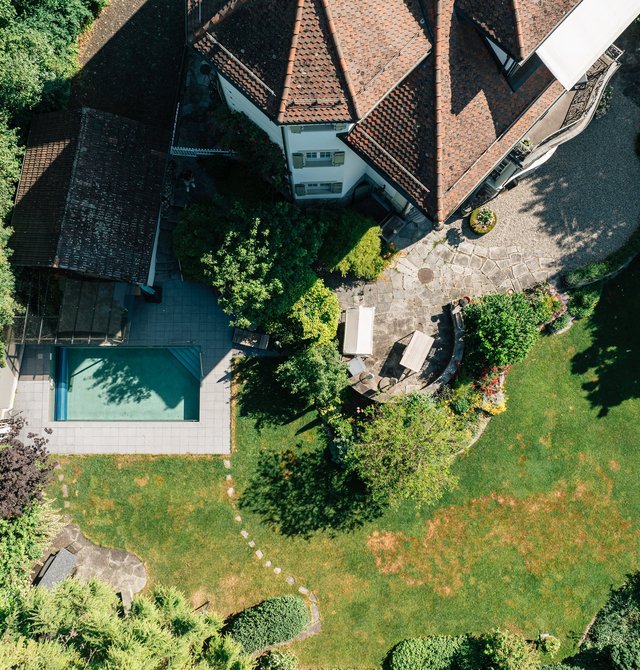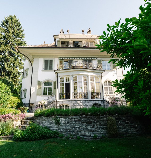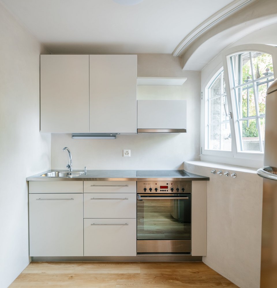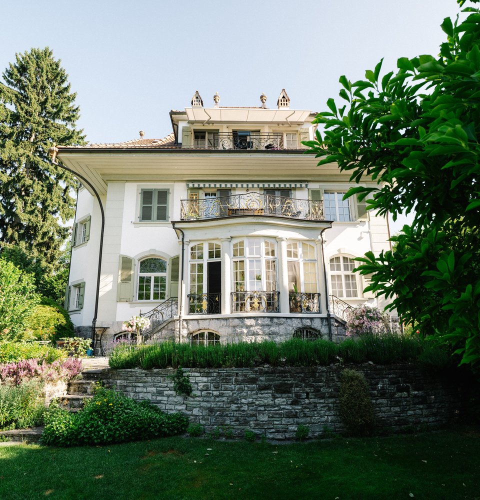 Die Wohnung liegt ruhig im Untergeschoss der Villa Benatzky (1922) – mit direktem Zugang ins Grüne und überraschend viel Licht durch grosse Bogenfenster.